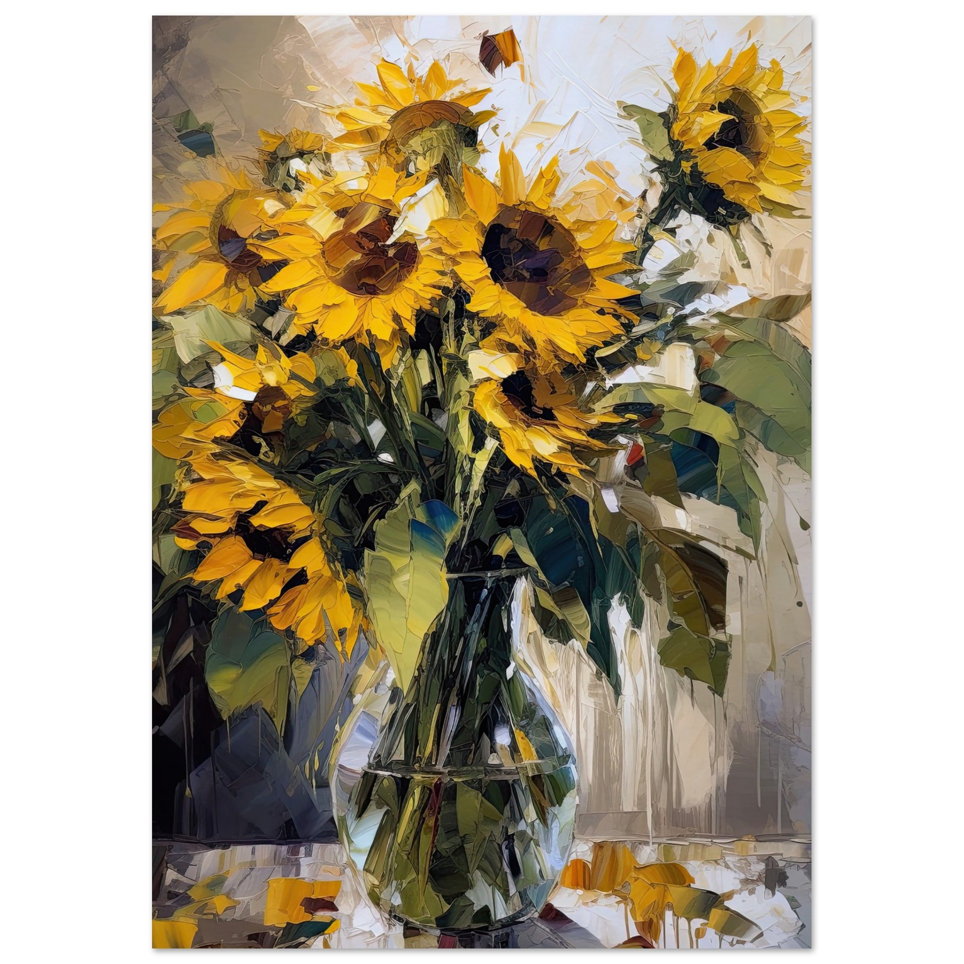 Transform your space with the vibrant energy of our art print. A bold, expressive portrayal of radiant sunflowers that come to life through dynamic palette knife strokes in luscious oil paint. This artwork radiates the exuberance of nature's beauty, bringing a burst of sunshine and vitality to your decor.