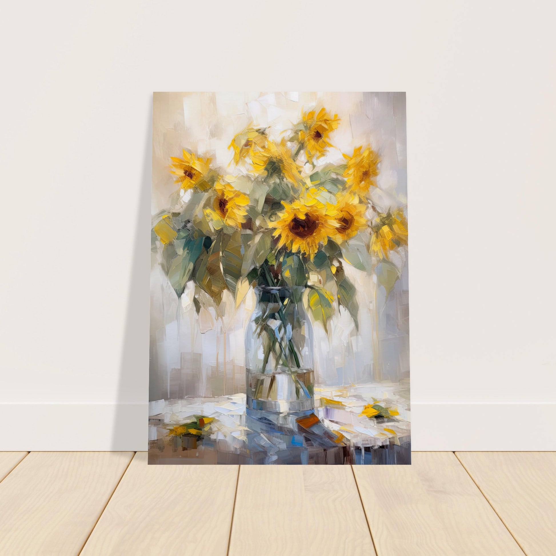 Transform your space with the vibrant energy of our art print. A bold, expressive portrayal of radiant sunflowers that come to life through dynamic palette knife strokes in luscious oil paint. This artwork radiates the exuberance of nature's beauty, bringing a burst of sunshine and vitality to your decor.