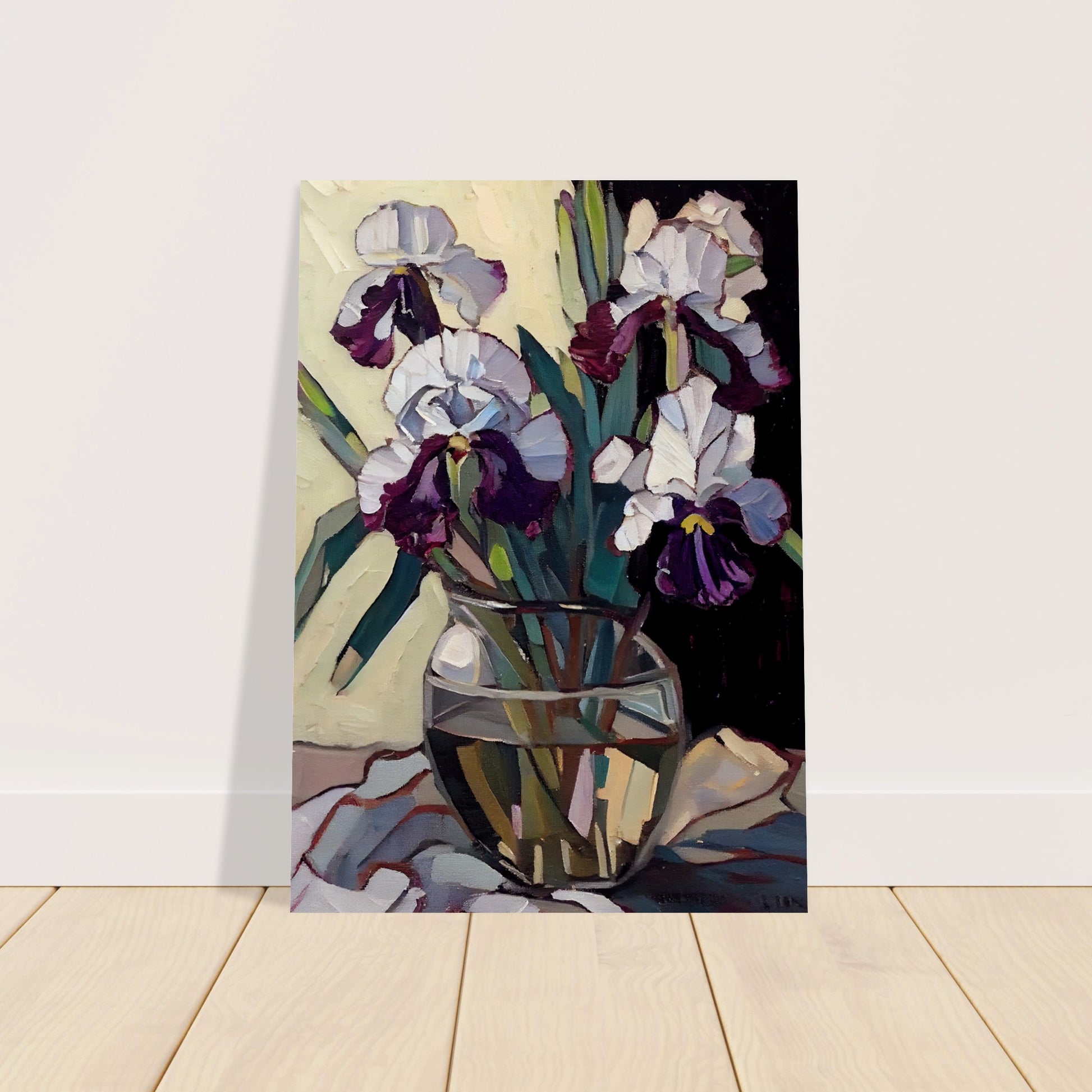 Immerse yourself in the world of artistry with our still life print. A glass vase brimming with irises takes centre stage, as if expertly rendered in thick, impactful oils. This artwork captures the timeless allure of nature's elegance and artistic mastery, adding depth and sophistication to your space.