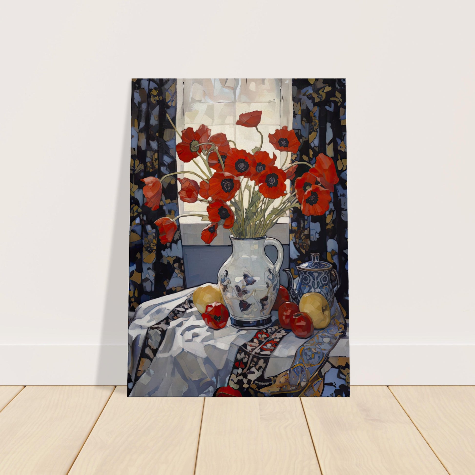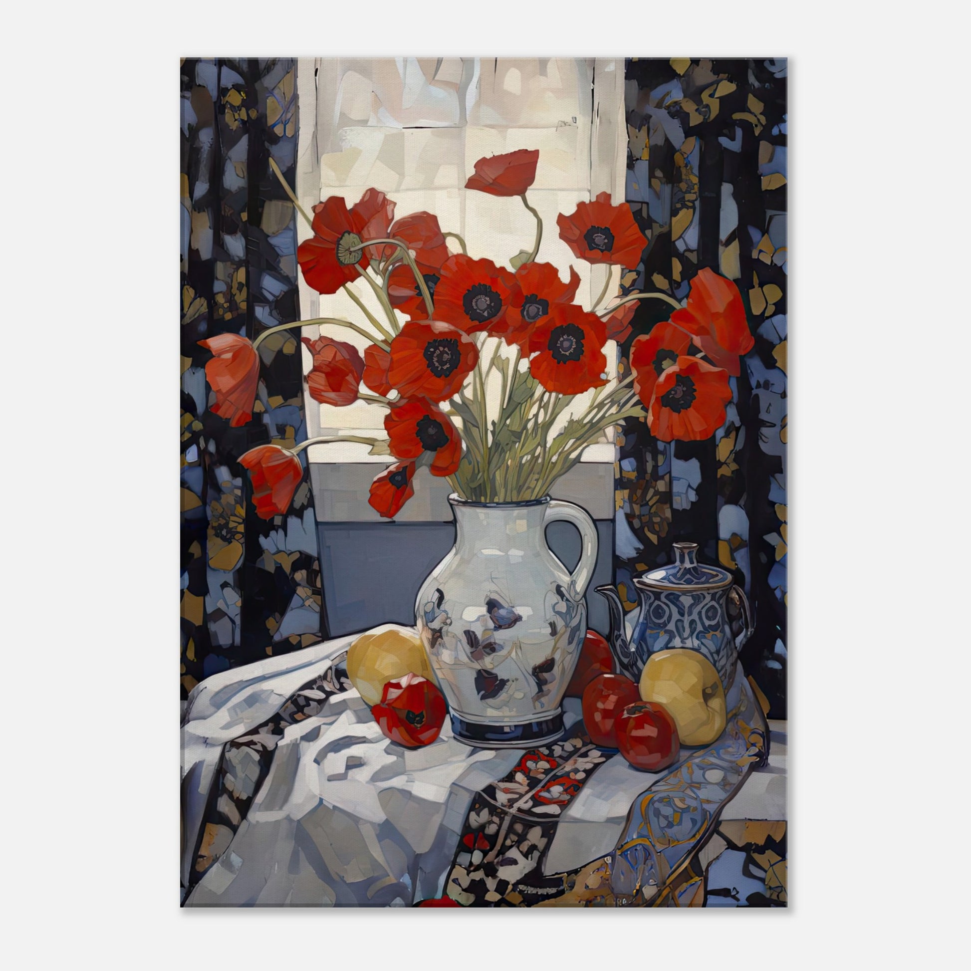Enjoy the delicate radiance of our printed canvas, where bright red poppies gracefully contrast with subtle, intricately patterned fabrics in soft sunlight. This sunlit still life captures the timeless elegance of nature and textile artistry, infusing your space with a serene and captivating beauty.