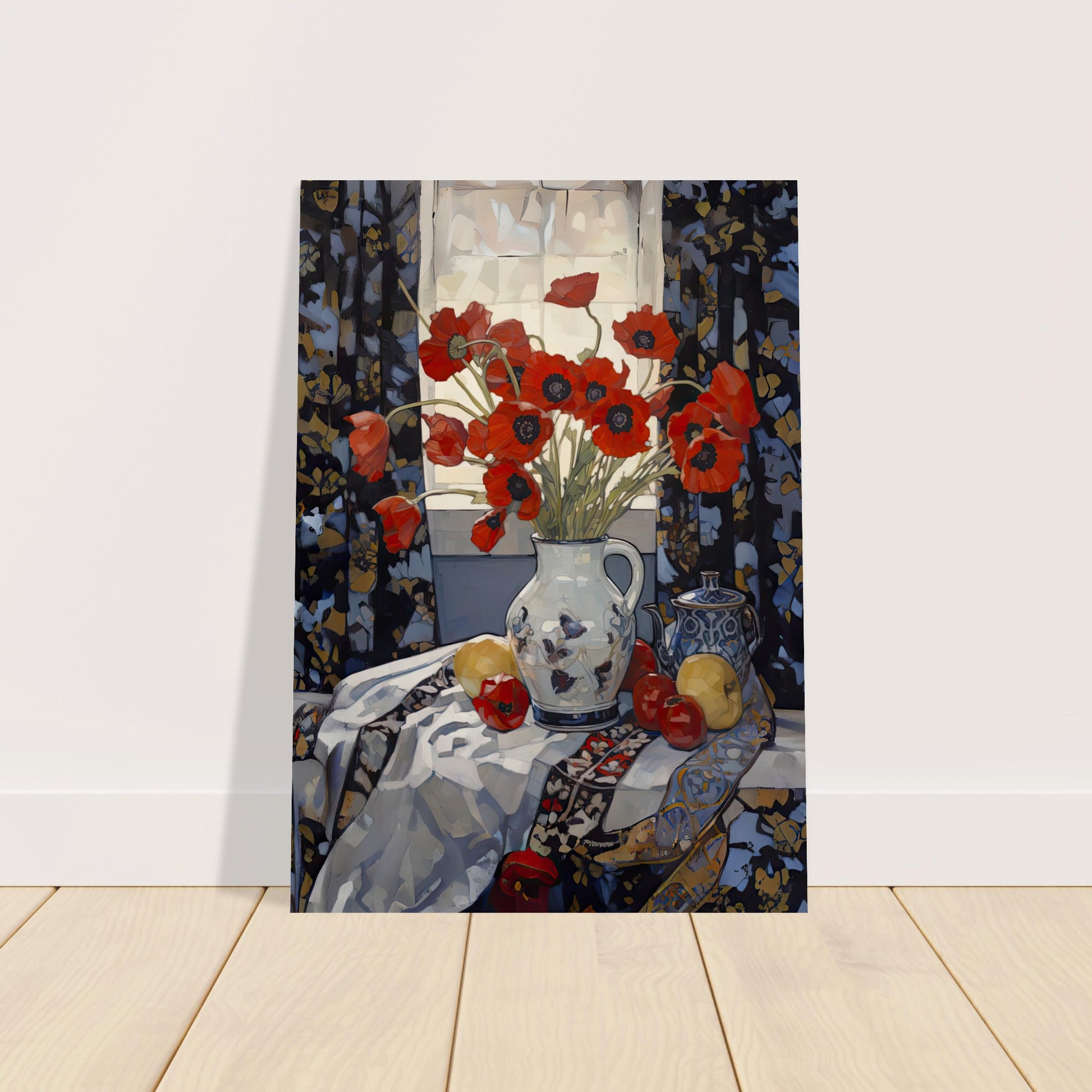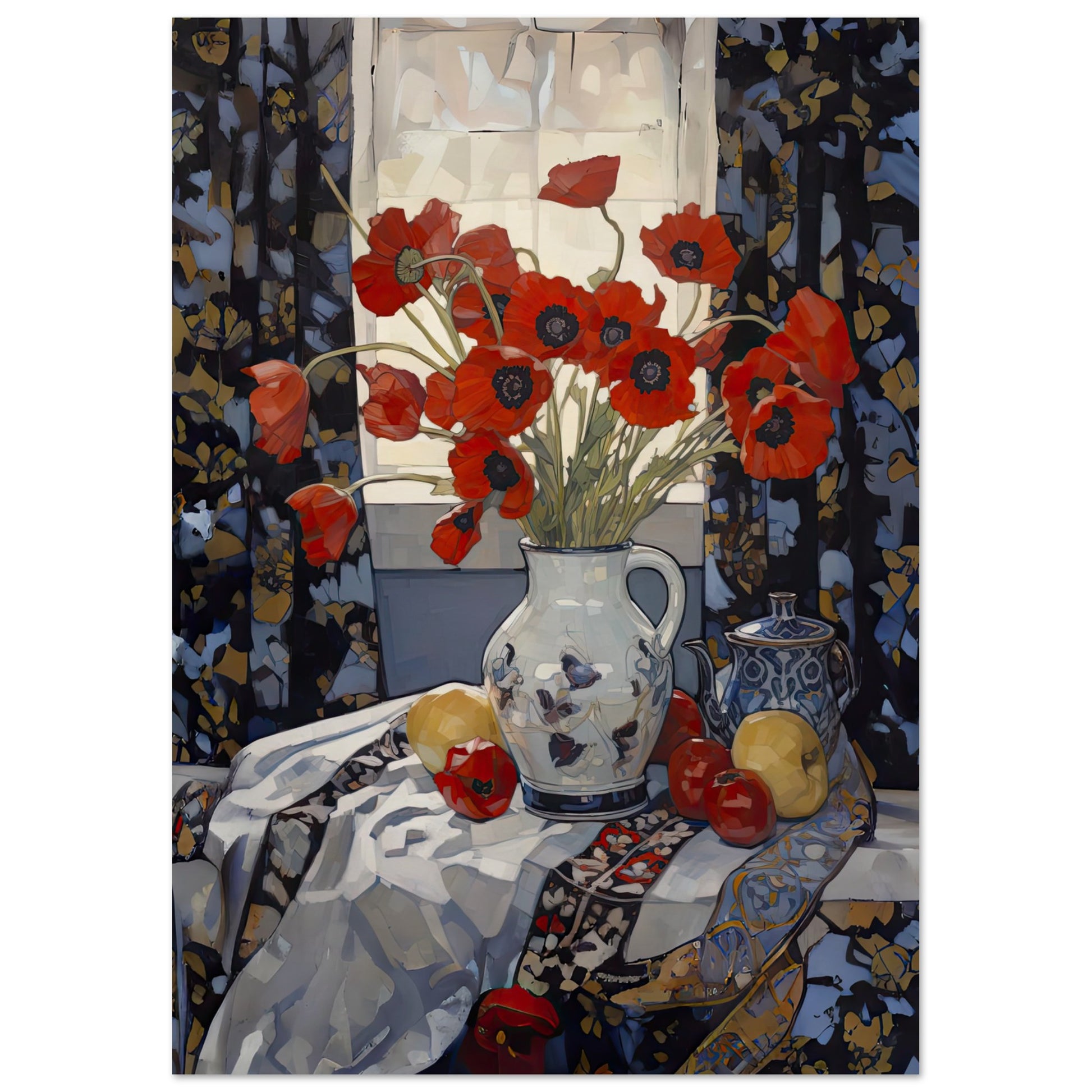 Enjoy the delicate radiance of our printed artwork, where bright red poppies gracefully contrast with subtle, intricately patterned fabrics in soft sunlight. This sunlit still life captures the timeless elegance of nature and textile artistry, infusing your space with a serene and captivating beauty.
