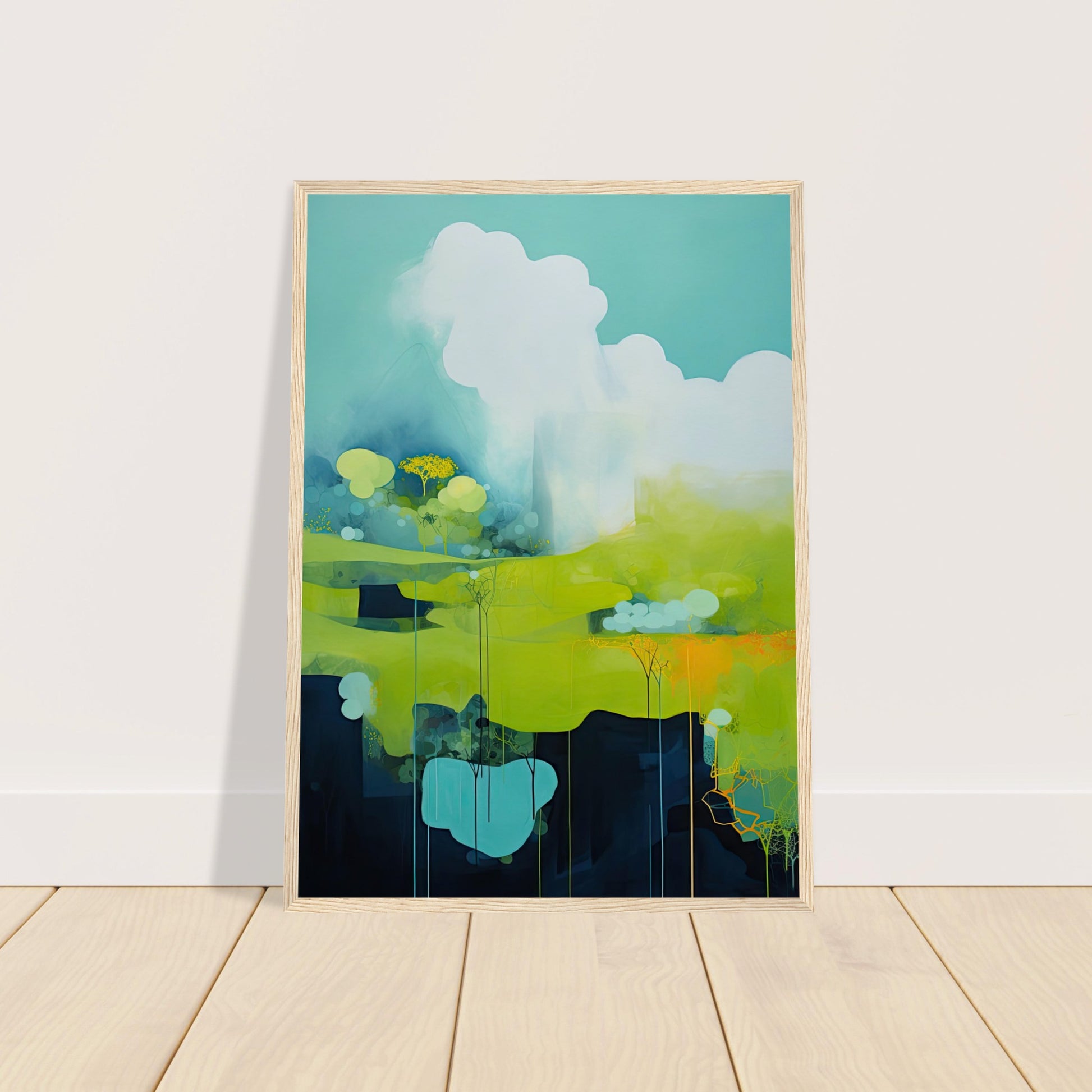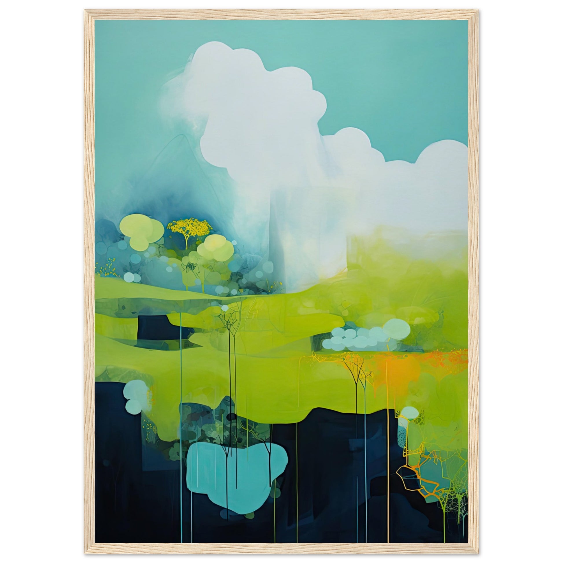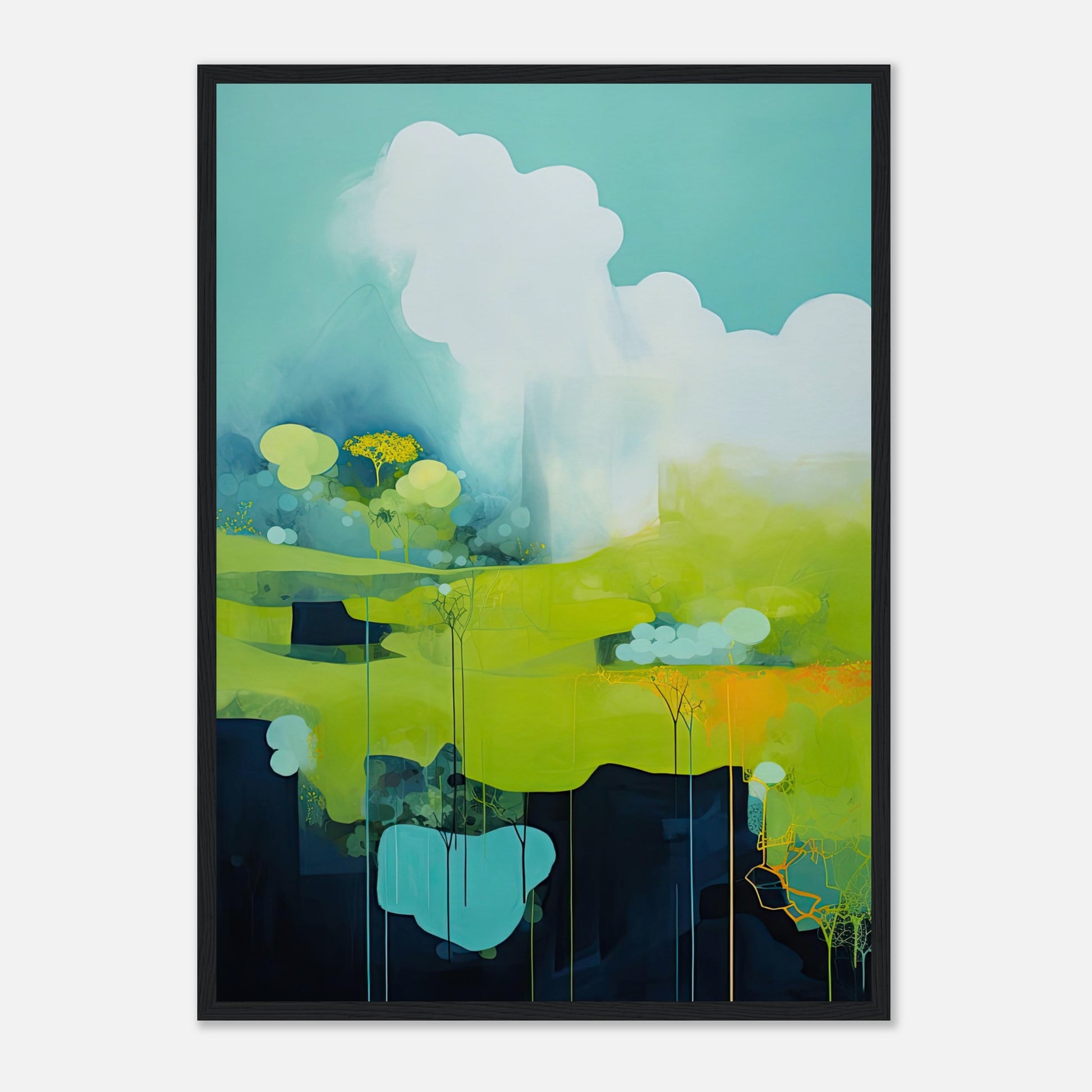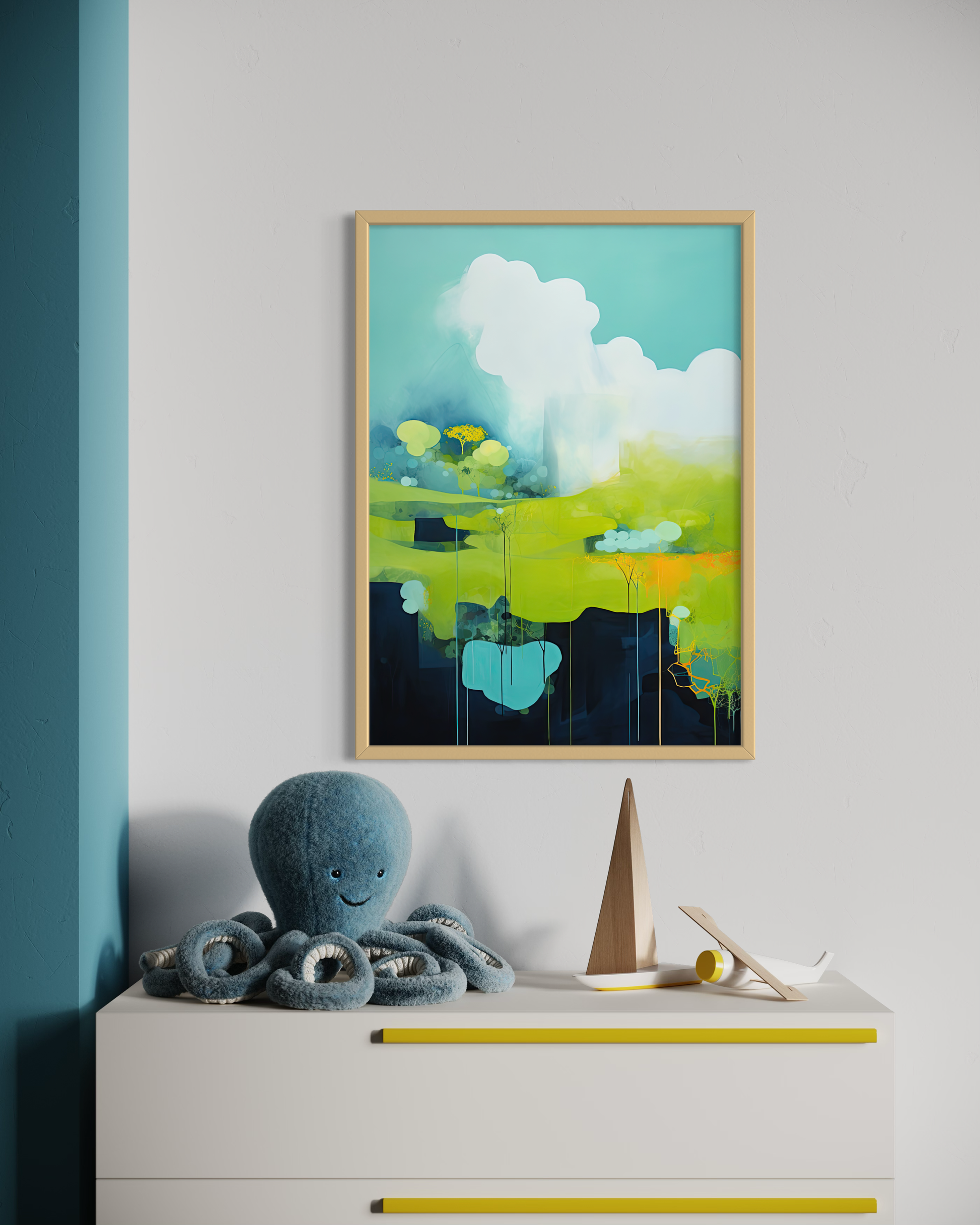 Experience the drama of nature's power with this collection of three framed prints. An abstract landscape unfolds in vivid turquoise, greens, and blues, accentuated by striking orange highlights. Painted in an expressive, free-flowing style, this artwork captures the dynamic dance of portentous clouds, delivering an electrifying addition to your space.  Enjoy one or indulge in the complete collection.