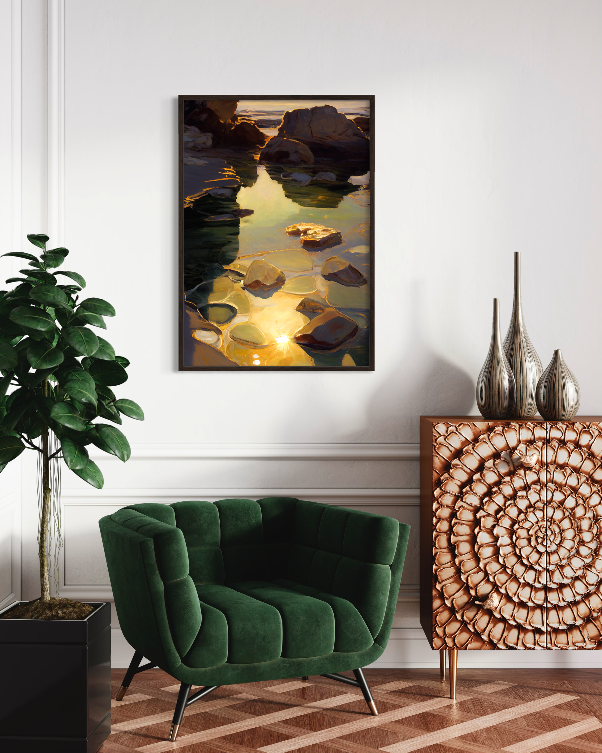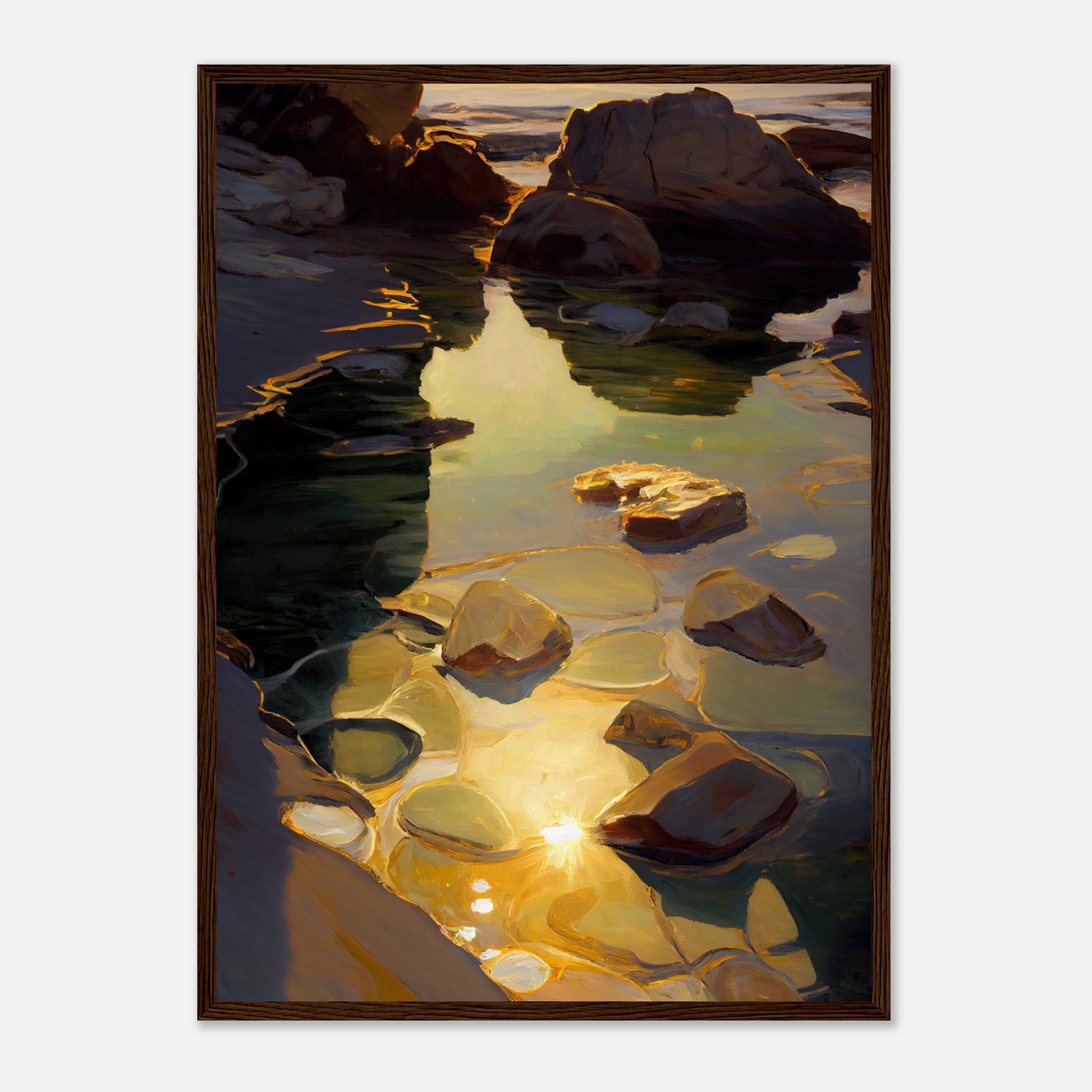 Transport your space to coastal serenity with our framed print. A shimmering seaside rockpool, bathed in the warm evening light, accentuates the play of golden rays on the inviting beachside palette. This artwork captures the tranquil beauty of the shore, infusing your surroundings with the soothing charm of a beachside retreat.